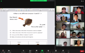 12 participants were divided into 3 groups and talked freely for 20 minutes in Japanese and 20 minutes in English, based on the themes given to them in advance, such as “Please describe your daily routine (example: morning, night, or all day). How has it changed over time?” At the end of the session, we took a photo with a big smile, as we always do. One new participant from America joined this time, so we hope to see him again. After the regular session, Yumiko, one of the participants, organized “Petit Cultural Exchange” so those who were interested joined. We learned the difference between Hirame fish and Karei fish, and we found that we use same English word to describe Hirame fish and Karei fish.