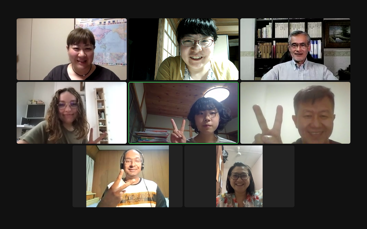 8 participants talked freely for 20 minutes in Japanese and 20 mins in English, based on the themes given to them in advance, such as “Which country would you like to travel to as most borders are opened and why?”. At the end of the session, we took a photo with a big smile, as we always do.