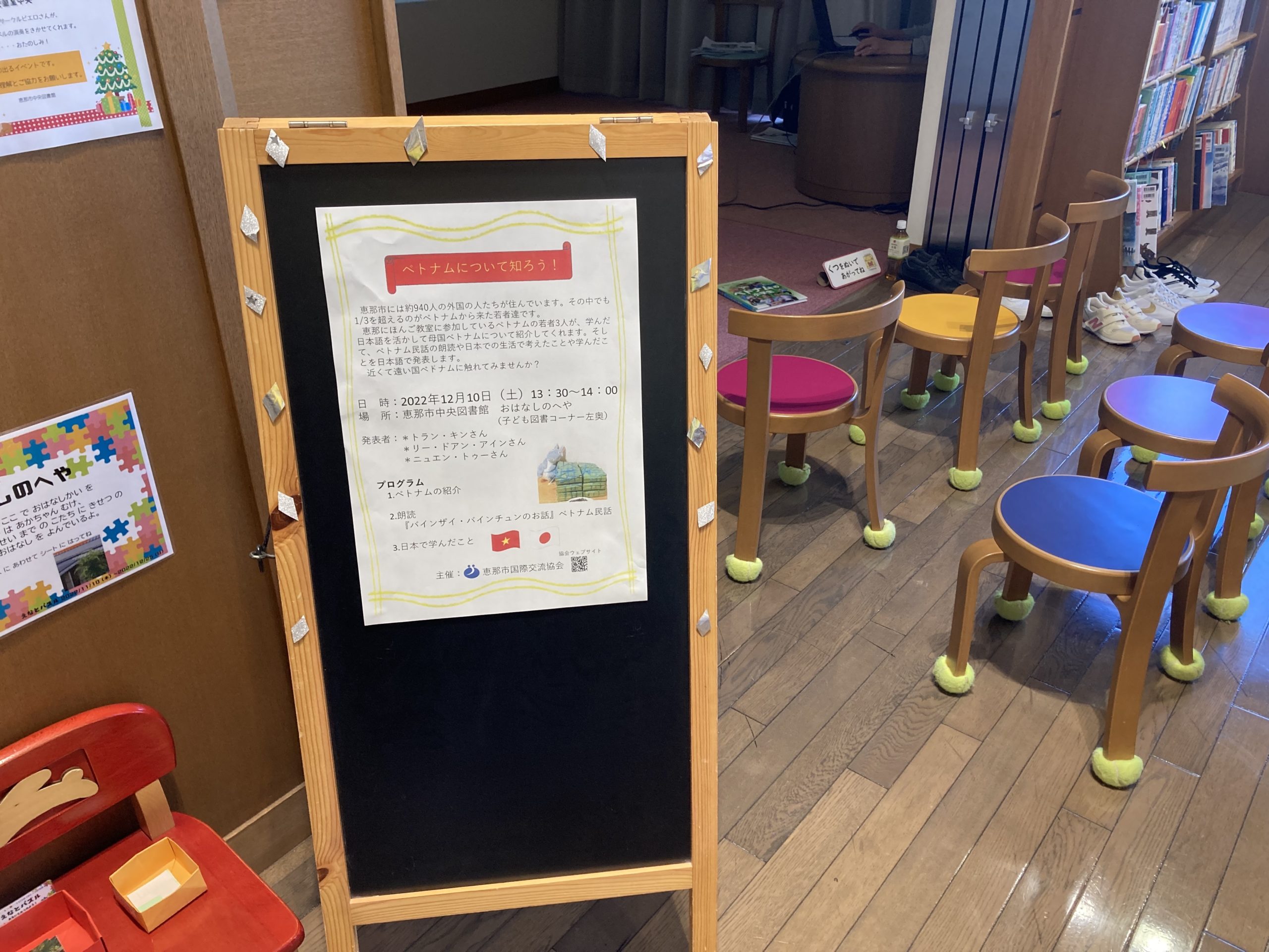 「ベトナムについて知(し)ろう!」と題(だい)して、恵那市(えなし)中央(ちゅうおう)図書館(としょかん)にて日本語(にほんご)教室(きょうしつ)に参加(さんか)しているベトナム出身(しゅっしん)の学習者(がくしゅうしゃ)が、日本語(にほんご)で発表(はっぴょう)をしてくれました。