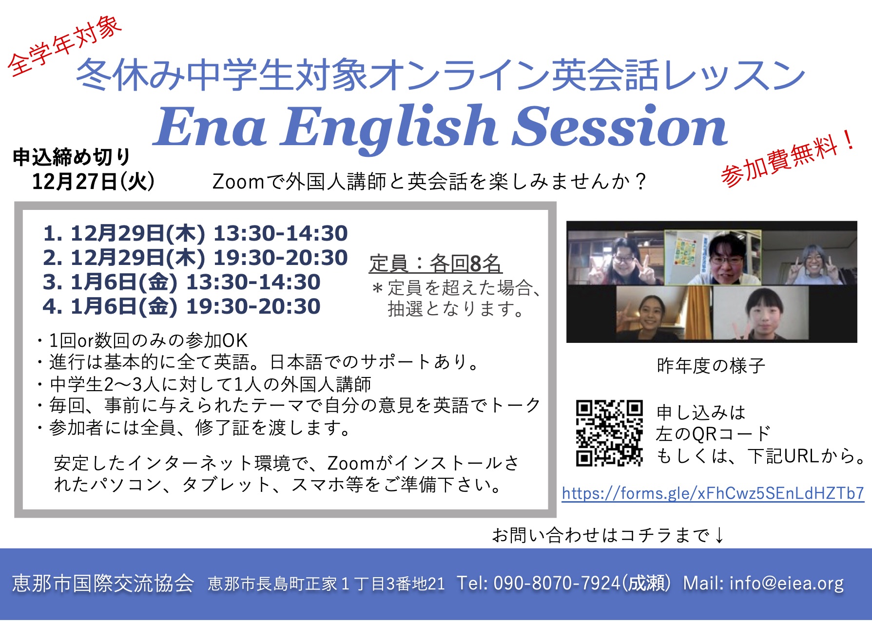 申し込みは27日(火)までなので、中学生の皆さん、是非、お申し込み下さい!