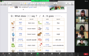 1回目は視覚、2回目は聴覚がテーマです。間違い探しやキツネダンスで話題になった歌を使って、楽しく英語を学びました。