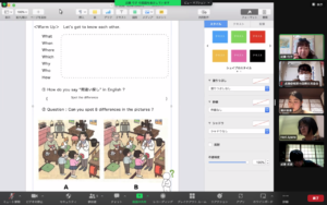 1回目は視覚、2回目は聴覚がテーマです。間違い探しやキツネダンスで話題になった歌を使って、楽しく英語を学びました。