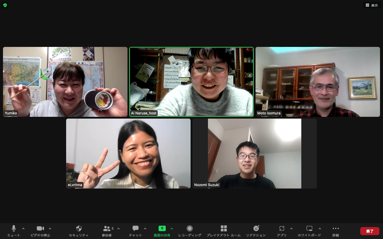 5 participants divided into 2 groups and talked freely in Japanese and English, based on the topic given them in advance, such as “Does your country have any holidays or events in winter or spring?”