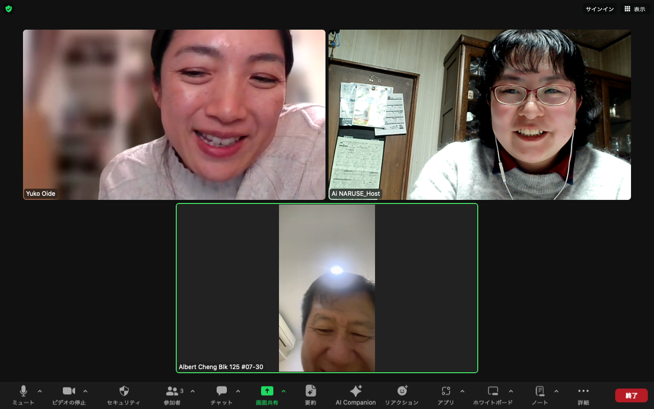 3名の参加者で「クリスマスの思い出」から、「長崎やシンガポール」について日本語と英語で話しました。
