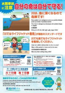 浅(あさ)い川(かわ)でも、泳(およ)ぎが上手(じょうず)な人(ひと)でも起(お)きています。自分(じぶん)の命(いのち)を守(まも)るために、ライフジャケットを着用(ちゃくよう)し、いざという時(とき)のための緊急(きんきゅう)通報先(つうほうさき)を確認(かくにん)しましょう。