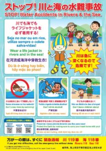 Every year, many water accidents occur regardless of whether it is Japanese or foreigners. They happen even in shallow rivers and even to good swimmers. To protect your own life, wear a life jacket and make sure you know where to call the emergency number.