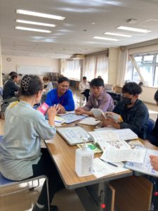 最初(さいしょ)にみんなで話(はな)し、そのあと、グループに分(わ)かれて、学習(がくしゅう)しました。