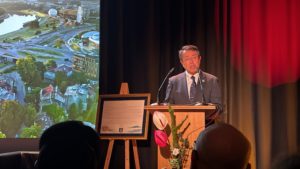 式典の前に、岐阜県が友好関係を築いているシロンスク県のティヒ市との国際交流担当者との懇談も。