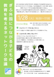 [募集]ぎふ外国につながる子どもの教育を考えるネットワーク会議 お知らせ 2025.01.18 当協会が参加している「ぎふ外国につながる子どもの教育を考えるネットワーク」からオンライン交流会のお知らせです。 外国につながる子どものサポートをしている方、これから始めようと思っている方、ご興味ある方など、ぜひ、お申し込みください。 岐阜県内のいろんな地域の、いろんなな立場の方が参加し、気軽に情報交換できます。 日時:1月28日(火)16:00~17:00 オンライン(Zoom) 申込みはコチラ↓ https://docs.google.com/…/169gtEoyB3lhfm2My…/viewform…