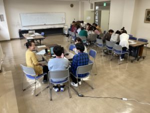 At the beginning, everyone listened to information on multilingual information from PR Ena. There were four first-time participants, so we introduced ourselves.