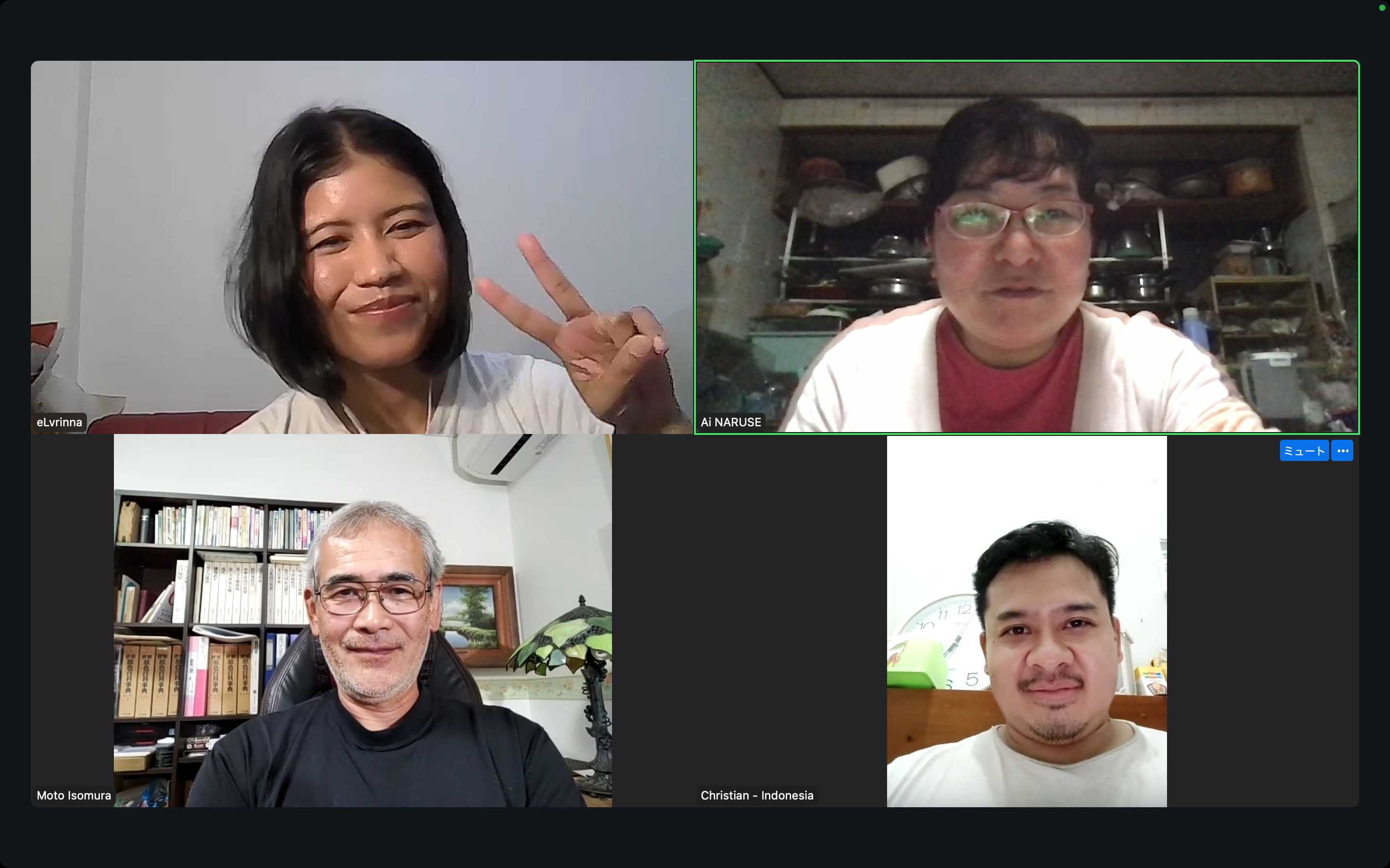 4名の参加者で、「最近では、(自由時間に)どんなことをして過ごすのが楽しいですか?」などについて、日本語と英語で話しました。