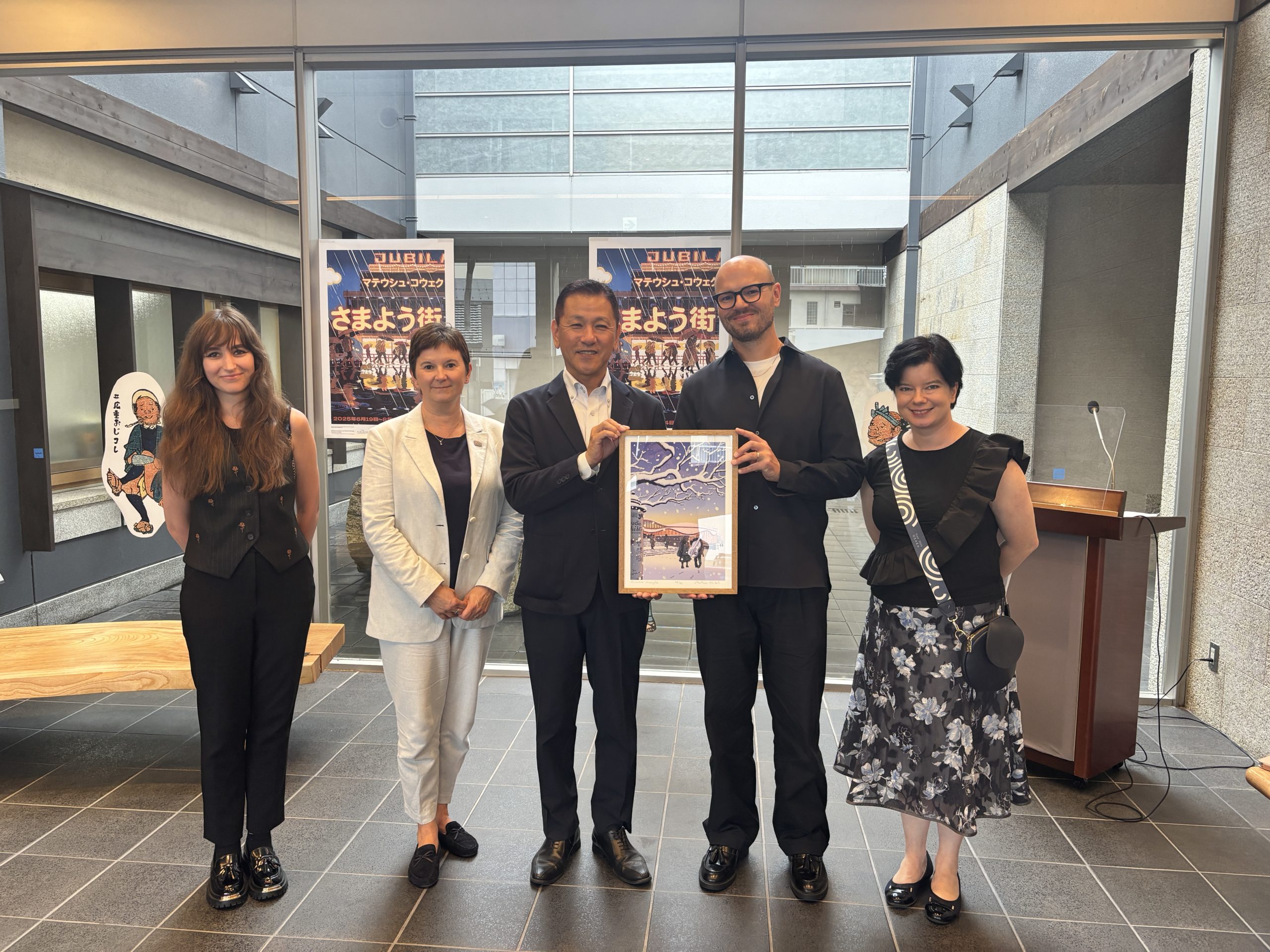 On 10 August (Sun), Mateusz Kowek visited Japan, and at 1:30 p.m., he gave a talk explaining his works. Works themed on Tokyo and Krakow were on display, and we heard interesting stories about how he creates his works.