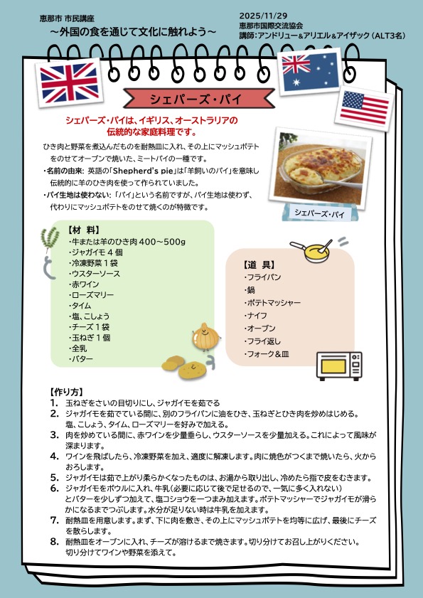 We welcomed Andrew and Isaac, ALT teachers from the Ena City Board of Education, as instructors and made the British and Australian dish “Shepherd’s Pie” together with six participants.